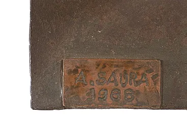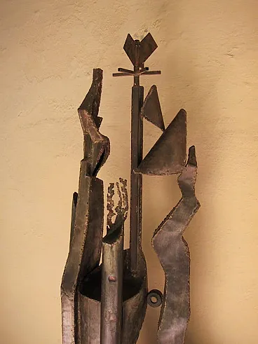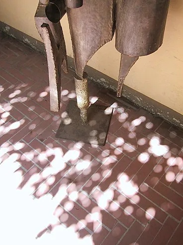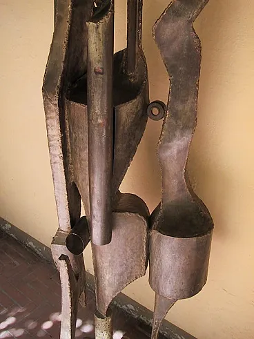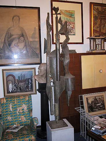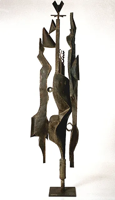 RARISSIMA SCULTURA DI GRANDI DIMENSIONI. FIRMATA: A. SAURA 1968 (Huesca, 22 settembre 1930 – Cuenca, 22 luglio 1998) REALIZZATA CON MATERIALE DI RICICLO FERROSO. SAURA PER BREVE PERIODO HA REALIZZATO QUESTO TIPO DI SCULTURE. LE SUE OPERE SONO PRESENTI IN TUTTI I MUSEI PIU' IMPORTANTI DEL MONDO. Non abbiamo autentica ma per comparazione, per studi sulle opere di scultura dell'artista, per qualità, per placca originale in ferro saldato con firma e data, ATTRIBUIAMO questa bellissima scultura a Antonio Saura. Antonio Saura Atarés (Huesca, 22 settembre 1930 – Cuenca, 22 luglio 1998) è stato un pittore e scrittore spagnolo, fratello del regista cinematografico Carlos. Biografia DA WIKIPEDIA Nato a Huesca, trascorse gli anni tra il 1936 ed il 1939 tra Barcellona, Valencia e Madrid a causa della Guerra di Spagna, al termine della quale visse ancora un anno a Huesca per poi tornare a Madrid. Nel 1943 contrasse la tubercolosi, malattia che lo costrinse a diversi interventi ed alla sostanziale immobilità per cinque anni. In questo periodo, iniziò da autodidatta a dipingere ed a scrivere e, superata la malattia, tenne la sua prima mostra con le opere che aveva studiato e dipinto a Saragozza nel 1950, a cui seguì un'altra a Madrid nel 1952; nel frattempo aveva pubblicato anche la sua prima opera poetica, Programio. Tra il 1954 ed il 1955 si trasferisce a Parigi, dove si unisce al gruppo dei surrealisti e dove, nel 1957, tiene una mostra alla Galérie Stadler. Tornato a Madrid, nel 1957 è uno dei fondatori del gruppo El paso, del quale rimase a capo fino al 1960, incontrando in questo periodo anche il critico Michel Tapié. A partire dal 1960 smette di dipingere esclusivamente in bianco e nero avvicinandosi sempre più al colore ed iniziando a creare anche alcune sculture. Nello stesso anno riceve il "Premio Guggenheim" a New York e intanto le sue opere cominciano ad essere esposte nei principali musei europei e americani. A partire dal 1966 compie diversi viaggi a Cuba, trovando nuova ispirazione per le sue opere e dove, nel 1968, partecipa al Congreso cultural dell'Avana. Nello stesso anno abbandona la tecnica dell'olio su tela per dedicarsi, per un periodo di circa dieci anni, alla pittura su carta, mentre nel 1969 dall'editore Gustavo Gili di Barcellona esce la prima monografia a lui dedicata, con testo di José Ayllón. Negli ultimi decenni della sua carriera sperimenta altre forme artistiche, dalla scultura alla vetrata (notevole una Crocifissione del 1965 nella chiesa di San Tomaso ad Amsterdam), dalla grafica alla pittura muraria, tecnica quest'ultima di cui rimangono in particolare l'opera Senza centro (1968), nel Museo de la revolución dell'Avana, e Elegia (1987), nel Palazzo comunale di Huesca. Muore a Cuenca nel 1998. Le sue opere sono oggi esposte in numerosi musei a livello mondiale, tra cui il Musée Picasso di Antibes, il Centre Pompidou di Parigi, lo Städelsches Kunstinstitut und Städtische Galerie di Francoforte sul Meno, la National Gallery e la Tate Modern di Londra, il Museo Nacional Centro de Arte Reina Sofía di Madrid, il Guggemheim Museum e il Metropolitan Museum di New York. Antonio Saura, noto principalmente come pittore e figura di spicco nell'ambito dell'informale europeo, ha occasionalmente realizzato sculture, rendendo opere come questa un elemento raro e prezioso all'interno della sua produzione. Questa scultura del 1968, alta ben 200 cm, è realizzata interamente in ferro saldato e materiali di recupero, caratteristiche che ne sottolineano il suo linguaggio espressivo unico e la sua attitudine sperimentale. - 1. Struttura e Materiali L'uso del ferro saldato e dei materiali di recupero riflette un approccio crudo e diretto, che potremmo definire "brutalista". La scelta di questi materiali sembra celebrare il valore dell'imperfezione e dell'essenzialità, esprimendo una tensione drammatica che attraversa l'opera. Le forme frastagliate e irregolari danno alla scultura un senso di movimento e instabilità, che contrastano con la solidità del ferro. L’assemblaggio suggerisce un’interazione dinamica tra le parti, con un equilibrio precario ma calcolato, evocando un senso di costruzione e decostruzione simultanea. Questo potrebbe essere letto come una metafora per la condizione umana o per le contraddizioni interne alla società contemporanea, temi che Saura affrontava anche nelle sue tele. - 2. Verticalità e Simbolismo La verticalità marcata della scultura, culminante in una sorta di "corona" o simbolo geometrico, invita a una lettura quasi totemica. Questa struttura slanciata sembra ergersi come una figura antropomorfa stilizzata, un richiamo a corpi frammentati o a sagome decomposte, temi centrali nella pittura di Saura. L'elemento simbolico sulla sommità può essere interpretato come un segno di autorità o trascendenza, in linea con la sua indagine sul sacro e il profano. - 3. Influenza dell’Informale L'opera conserva l'impronta dell'informale, movimento che esplora il gesto e la materia come mezzo di espressione pura. Le superfici del ferro mostrano segni di lavorazione, graffi, e imperfezioni che richiamano la pittura materica e gestuale. Questa scultura, quindi, potrebbe essere vista come una "pittura tridimensionale", dove il gesto pittorico si traduce nella manipolazione del metallo. - 4. Dimensione drammatica L'opera trasmette una forte tensione emotiva, quasi teatrale. La monumentalità (due metri di altezza) e la forma slanciata contribuiscono a creare una presenza imponente, che dialoga con lo spazio circostante. La scelta dei materiali, con il loro peso e la loro durezza, amplifica questa drammaticità, mentre l'uso di elementi riciclati introduce un senso di storia e memoria nell'opera. . 5 Interpretazione e Rarità La rarità di questa scultura amplifica il suo valore sia estetico che storico. Saura, essendo un artista noto soprattutto per la sua pittura, offre qui una testimonianza unica del suo talento nel trasferire i suoi concetti