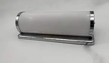 Applique coppia da parete in vetro di design moderno e lineare, caratterizzata da una struttura tubolare orizzontale che conferisce eleganza e uniformità alla diffusione luminosa. Il corpo principale è realizzato in vetro lattimo (vetro opalino bianco) soffiato, che consente una diffusione morbida e omogenea della luce, ideale per creare un’atmosfera calda e accogliente. Le estremità del tubo sono rifinite con anelli di ottone cromato lucido, che aggiungono un tocco di raffinatezza e contrastano piacevolmente con la superficie opaca del vetro.La base è in ottone . Cromatura originale. L'applique ha un aspetto sobrio e versatile, adatto a contesti sia classici che contemporanei, come corridoi, bagni, ingressi ,camere da letto o in bagno di fianco allo specchio. Pochi segni del tempo, ha all'interno 2 portalampada e 14, impianto elettrico nuovo, attribuita alla ditta Greco.