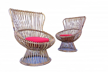 Coppia di poltrone in vimini modello Margherita disegnate da Franco Albini e prodotte da Bonacina. Cuscino nuovo in tessuto rosso.