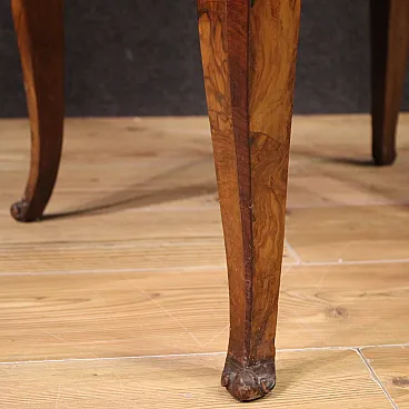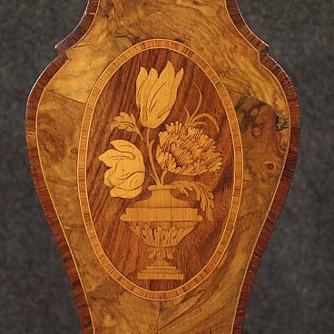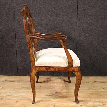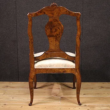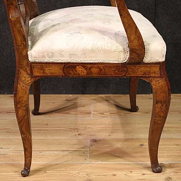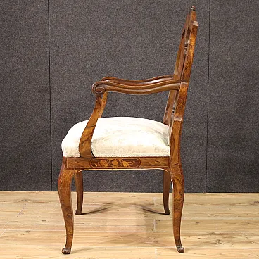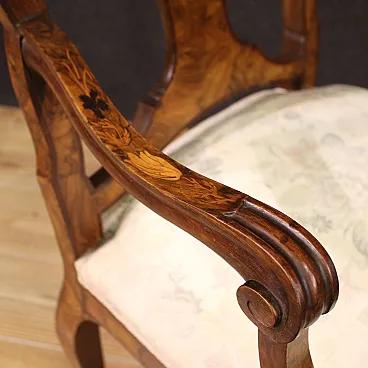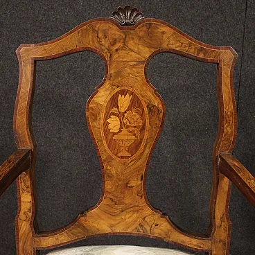Poltrona italiana della metà del XX secolo. Mobile finemente intarsiato con decoro floreale sullo schienale, impiallacciato in legno di noce, radica, bois de rose, acero, e legni da frutto. Poltrona con braccioli lignei sostenuta da quattro solide gambe. Seduta rivestita in tessuto floreale senza strappi o macchie, di buona comodità. Altezza alla seduta di 50 cm. Mobile ideale da inserire in una camera o studio, per antiquari o arredatori. In buone condizioni.