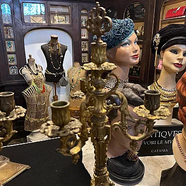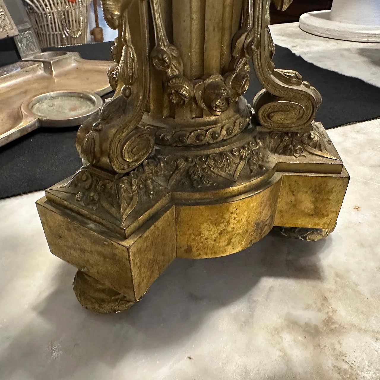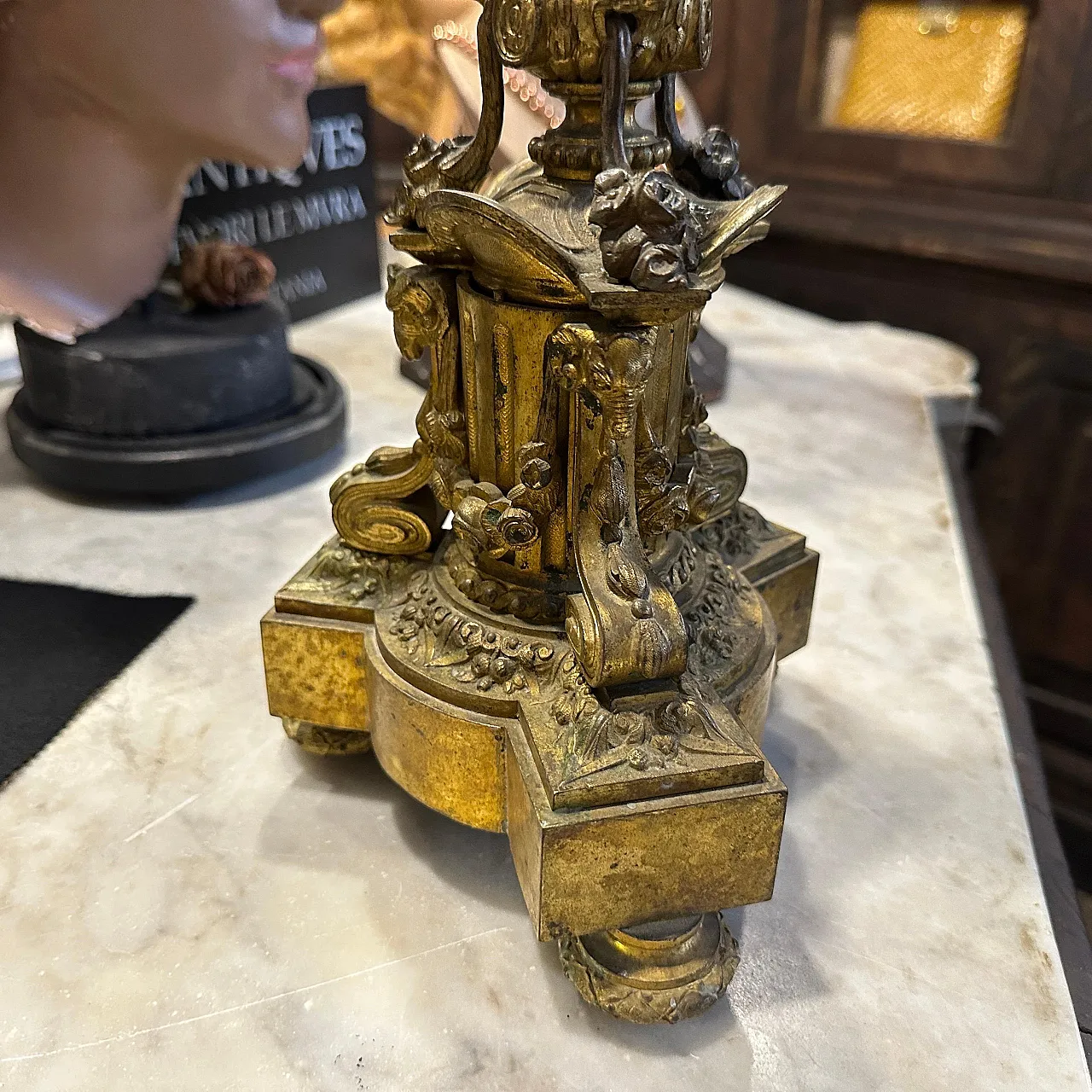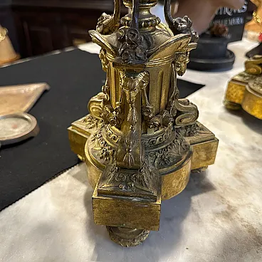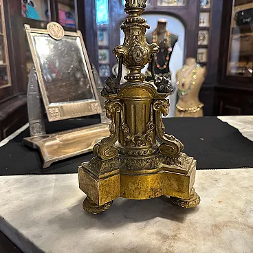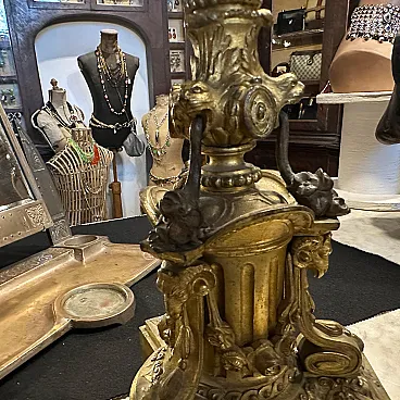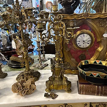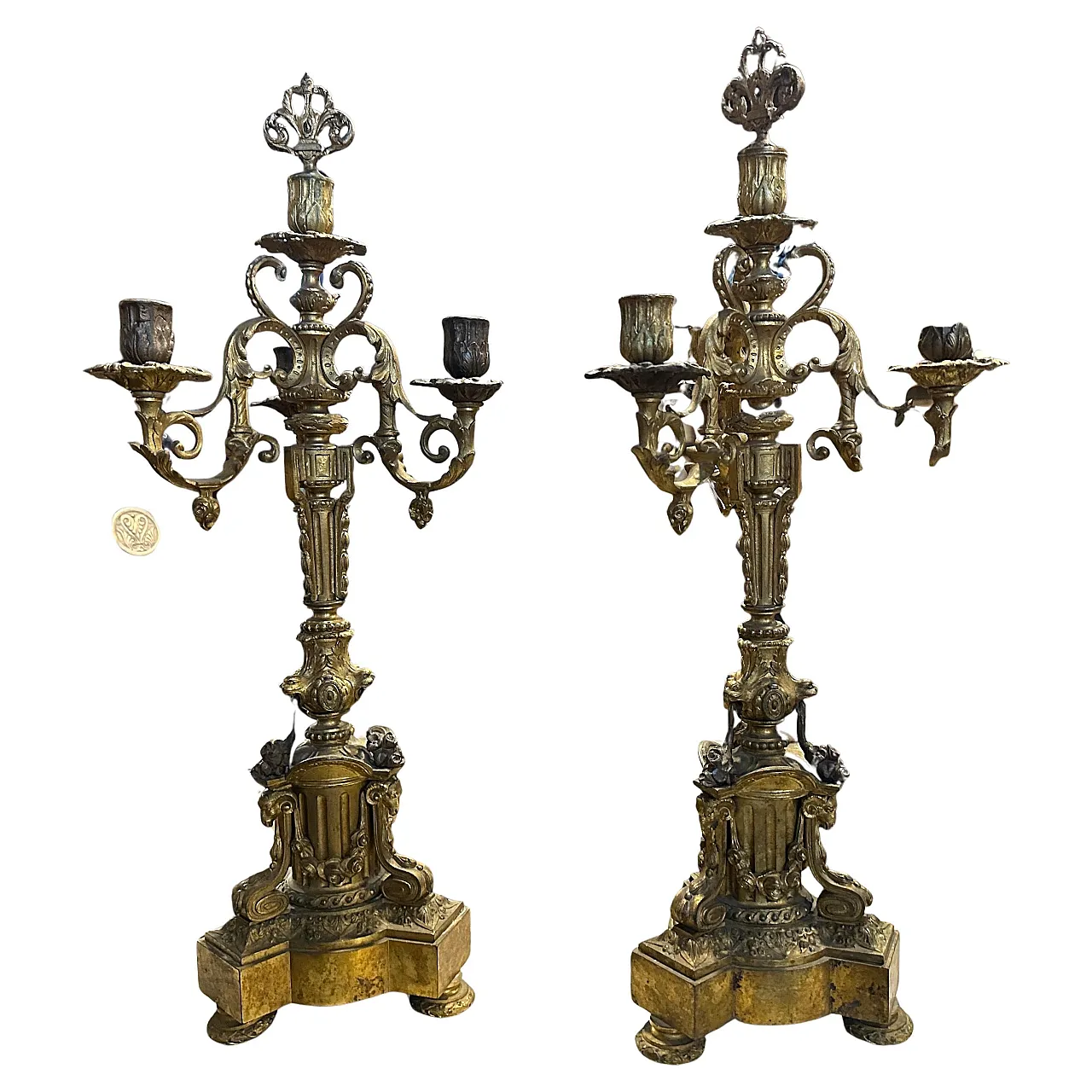 Coppia di candelabri in bronzo dorato del Secondo Impero italiano del XIX secolo Aggiungi una grandezza senza tempo al tuo spazio con questa eccezionale coppia di candelabri italiani in bronzo dorato del Secondo Impero, risalenti al XIX secolo. Ricco di ornamenti e splendidamente fuso, ogni candelabro presenta tre bracci di candela ornati da intricate volute e motivi classici, tutti sostenuti da una colonna centrale elaborata e dettagliata e da una base a gradini. La finitura dorata patinata evoca l'opulenza del vecchio mondo, mentre la forma scultorea offre una presenza imponente, perfetta per affiancare un caminetto, una credenza o come centro tavola scenografico. Buone condizioni d'epoca, con usura e ossidazione tipiche dell'età e dell'uso; alcune prese per candele mostrano resti di cera. Questa straordinaria coppia fonde forme classiche e materiali pregiati: ideale per i collezionisti di antiquariato europeo o per chi cerca un tocco di regalità nei propri interni.