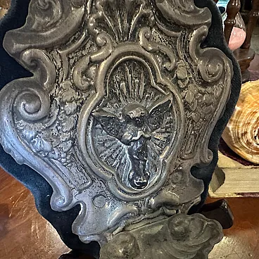 Acquasantiera italiana vintage anni '60 - Metallo e velluto ornato Aggiungi un tocco di fascino sacro al tuo spazio con questa squisita acquasantiera italiana del 1960, realizzata in metallo finemente dettagliato e montata su un supporto di velluto nero. Caratterizzato da un'immagine splendidamente fusa di un angelo in preghiera, circondato da intricate decorazioni in stile barocco, questo oggetto devozionale mette in mostra la classica maestria italiana. Patina d'epoca con segni di usura dovuti all'età; nel complesso ottime condizioni d'epoca. Ideale per i collezionisti di manufatti religiosi, per gli appassionati di arredamento vintage o come regalo sacro unico.