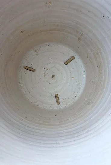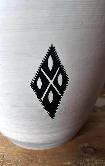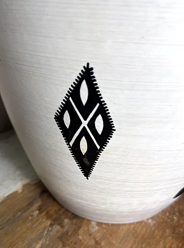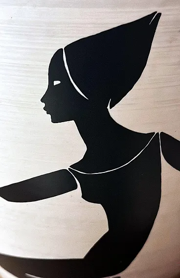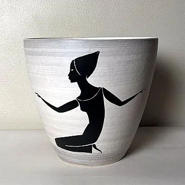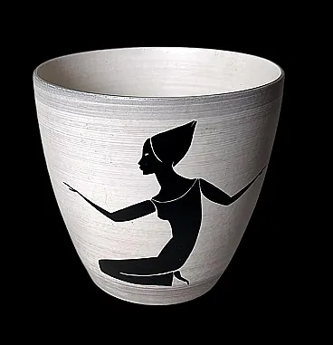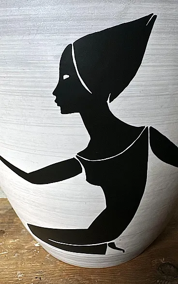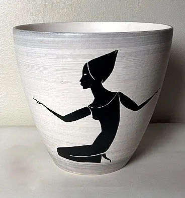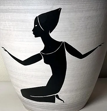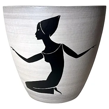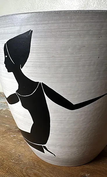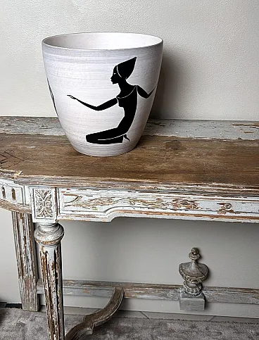 Elegante e distintivo cachepot in gres porcellanato, una ceramica ad alta cottura nota per la sua eccezionale resistenza e densità, comunemente utilizzata per oggetti decorativi e di interior design di alta qualità. La superficie è stata lavorata al tornio e rifinita con uno smalto opaco, caratterizzato da sottili variazioni tonali che ne evidenziano la lavorazione artigianale. La decorazione, interamente dipinta a mano (come indica l'iscrizione principale del decoro sulla base), raffigura una figura femminile stilizzata ispirata all'arte africana. Realizzato in Silhouette nera su uno sfondo chiaro, il design riflette l'estetica primitivista e modernista degli anni Cinquanta. Sul retro, un motivo ornamentale geometrico fornisce un equilibrio visivo alla composizione. Il lato inferiore reca la firma "Milet", il marchio impresso "Sèvres" e il decoro principale inciso a mano, a conferma della sua origine artigianale. Questo tipo di marchio è tipico degli studi indipendenti o dei piccoli atelier associati alla produzione dell'epoca moderna nel distretto di Sèvres. L'artista, Paul Milet, è stato un ceramista attivo nella seconda metà del XX secolo, noto per le sue collaborazioni con i laboratori di Sèvres, una delle istituzioni ceramiche più importanti della Francia. Sebbene non sia molto conosciuta dal grande pubblico, l'opera di Minet è molto apprezzata per la sua qualità grafica e il suo raffinato linguaggio formale. I pezzi firmati "Milet Sèvres" sono in genere datati tra gli anni '40 e '60. Questo cachepot può essere datato intorno al 1950. La sua forma alta e affusolata e la sua finitura opaca, insieme al sorprendente contrasto tra le decorazioni stilizzate nere e lo sfondo chiaro, ne fanno un esempio convincente del modernismo ceramico francese del dopoguerra. L'equilibrio grafico e la precisione formale della decorazione sono in perfetta armonia con i movimenti artistici modernisti dell'epoca. La firma "Milet Sèvres" e l'iscrizione principale del decoro sulla base testimoniano la finezza e l'unicità dell'oggetto. Questo raffinato cachepot è ideale per valorizzare gli interni modernisti, eclettici o Mid-Century. Sia che venga utilizzato come vaso decorativo o come scultura in ceramica a sé stante, può essere esposto su una consolle vintage, su un mobile bar in legno di alta qualità o anche in uno spazio minimalista, dove la sua audace presenza grafica e le sue linee pulite diventeranno un punto di riferimento visivo. Perfetto anche per i collezionisti di ceramiche d'artista o per aggiungere un tocco di sofisticato esotismo a un angolo lettura o a una libreria. Il cachepot è in buone condizioni vintage. Dimensioni: diametro 27 cm (10,6 in), altezza 26 cm (10,2 in).