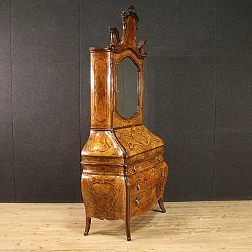 Trumeau lombardo della metà del XX secolo. Mobile mosso e bombato in stile Rococò riccamente intarsiato in legni di noce, radica, acero, faggio e legni da frutto. Trumeau doppio corpo munito di tre capienti cassetti e calatoia nella parte inferiore. Interno anch'esso intarsiato completo di 5 cassettini, due piccoli vani porta documenti e piano scrittoio di buona misura e servizio. Corpo superiore ad un'anta con specchio incassato, interno con due ripiani più piano a basamento (vedi foto) di discreta capacità. Trumeau di favolosa linea e piacevole arredamento ideale da inserire in un salone o studio, per antiquari e arredatori. Presenta una piccola mancanza di decoro ligneo alla base dell'alzata (vedi foto). Completo di due chiavi funzionanti dell'anta superiore e della calatoia. In bella patina, nel complesso in buono stato conservativo con una piccola mancanza di decoro ligneo.