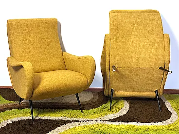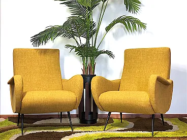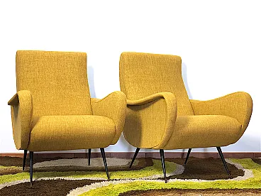 Coppia di Poltrone "LADY" Anni 50 Design attribuito a MARCO ZANUSO capolavoro del made in Italy, Lady è stata premiata con la Medaglia d’Oro alla IX Triennale di Milano del 1951. Le Poltrone sono di manifattura Italiana ,completamente restaurate con rivestimento e interni nuovi,tessuto di cotone nel colore Light Yellow,inconfondibile style della scocca del Designer Marco ZANUSO ,piedi in metallo e Ottone con il tipico Design degli anni 50. CONDIZIONI PERFETTE Misure Altezza cm 90/Larghezza cm 64/Profondità cm 90/Altezza seduta cm 40/ Seduta cm 50 X cm 40