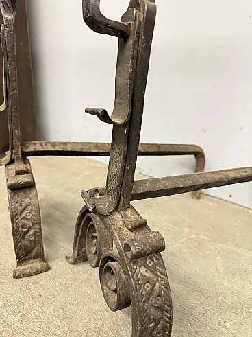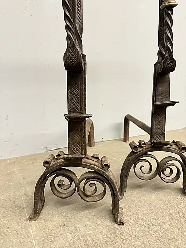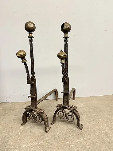 Antica coppia di alari in ferro battuto e bronzo XVII sec, 74x22x44cm