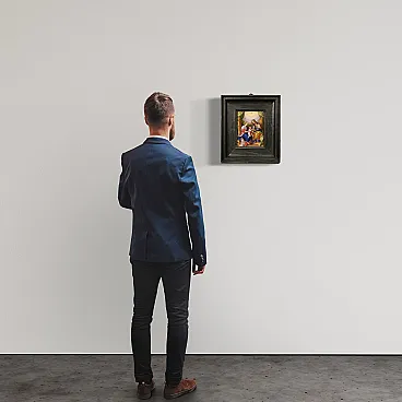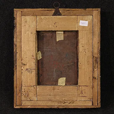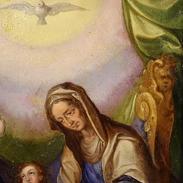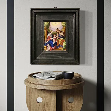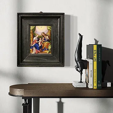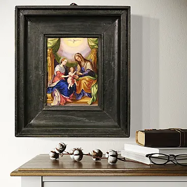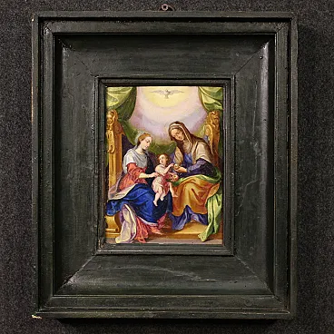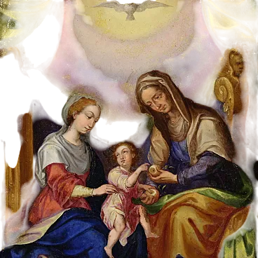 Raro dipinto italiano del XVIII secolo. Raffinata miniatura ad olio su rame raffigurante la Vergine Maria, Sant'Anna e il Bambino Gesù. Le due donne sono sedute su un grande trono dorato, al centro della composizione il bambino è tenuto dalla Madonna mentre Sant'Anna gli porge una mela. Il frutto in questione potrebbe alludere al peccato originale, che Cristo è venuto a redimere. In alto, in un cielo luminoso tra splendidi drappi verdi troviamo la colomba dello Spirito Santo, simbolo della trinità. Quadro di notevole qualità pittorica che si distingue per i colori brillanti e saturi, i sontuosi panneggi e lo straordinario livello di dettaglio. Elegante cornice del XX secolo in legno intagliato e dipinto, di bella decorazione, con alcuni segni del tempo. Opera già restaurata con ripresa del colore in piccoli punti, nel complesso in buono stato conservativo. Luce dipinto H 22 x L 16 cm.