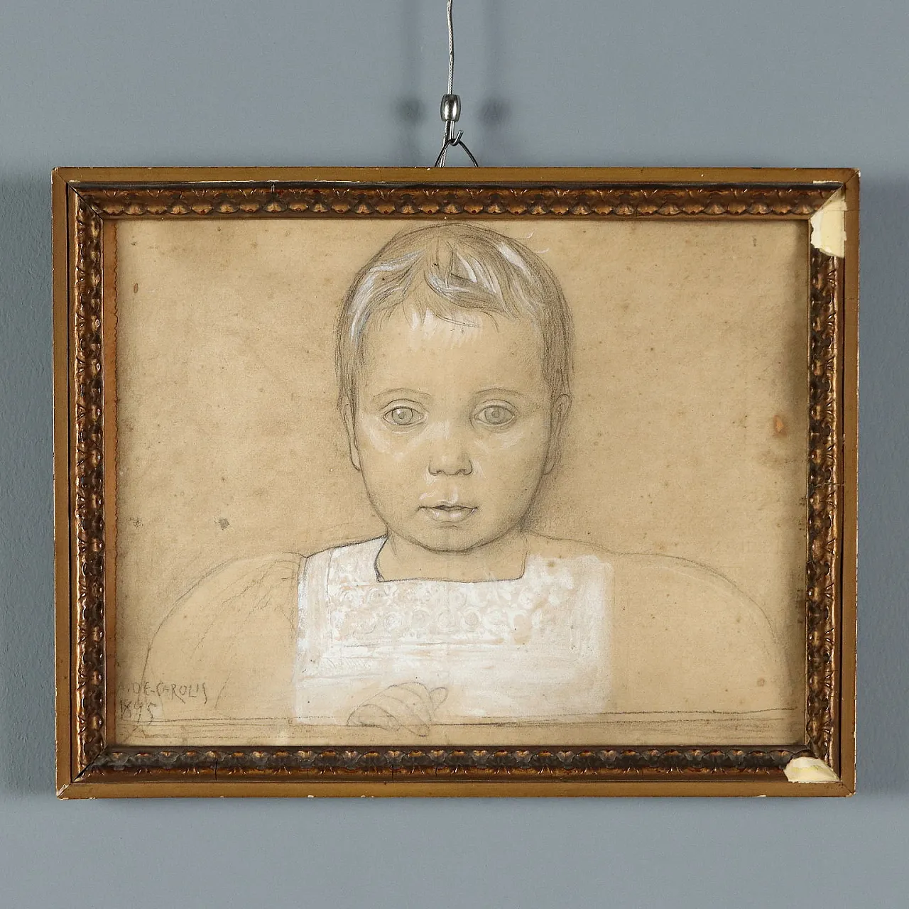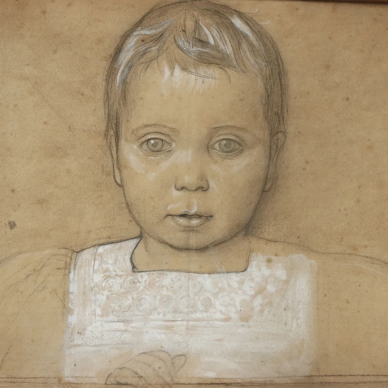Matita e biacca su carta. In basso a sinistra presenti la firma e la data. Al retro a matita è scritto il nome del bimbo ritratto, Nino, appartenente alla famiglia di provenienza dell'opera.