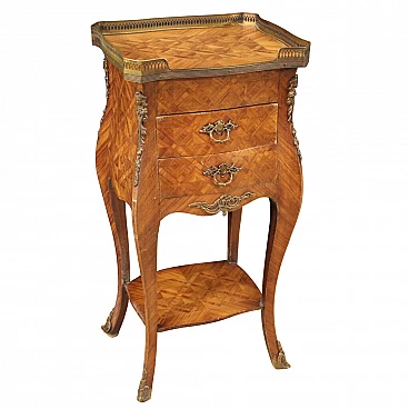 Tavolino francese del XX secolo. Mobile adornato da intarsio geometrico in legno di bois de rose con decori in bronzo e ottone cesellato. Comodino munito di due cassetti frontali e uno laterale molto capienti. Piano superiore ligneo completo di ghiera in ottone (vedi foto). Mobile da centro che offre un secondo piano di appoggio nella parte inferiore. Presenta qualche piccola mancanza di impiallacciatura, nel complesso in discreto stato conservativo.