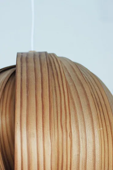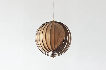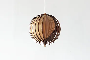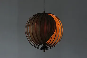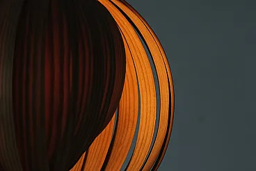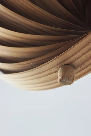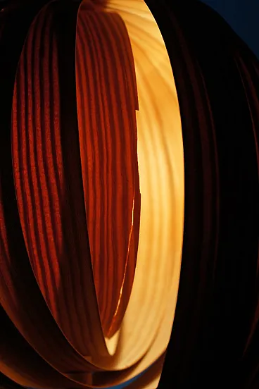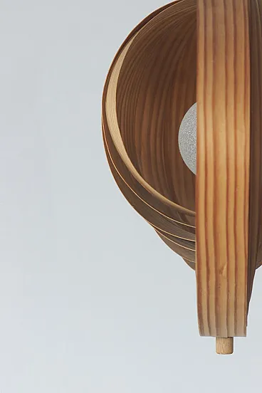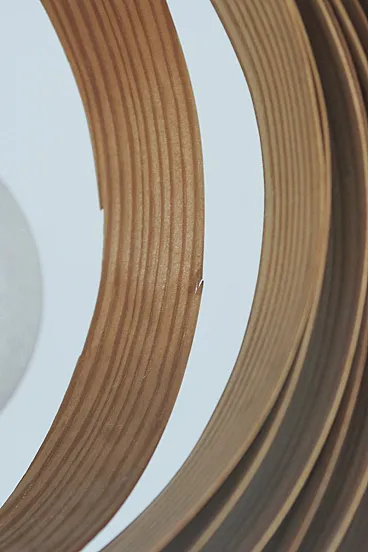 La lampada Moon, disegnata da Hans Agne Jakobsson, È un esempio iconico del design scandinavo degli anni '60, che unisce eleganza e modernità. Il suo design fa riferimento alla luna, da cui il nome "Moon Lamp". Si tratta di una lampada da soffitto dalla forma sottilmente arrotondata e sferica. La lampada Moon ha una forma sottile e scultorea che, quando è accesa, può ricordare la luna o un oggetto celeste, creando un bagliore caldo e lunatico. Le opere di Jakobsson sono caratterizzate da un equilibrio tra minimalismo e funzionalità, con un'enfasi sulla qualità della lavorazione. che erano spesso caratterizzate da linee pulite, forme organiche e un'enfasi sui materiali naturali. La lampada è realizzata con sottili doghe di pino. Le lamelle verticali sono disposte a ventaglio per consentire una regolazione individuale della luce. I cerchi disposti intorno alla sorgente luminosa danno una luce morbida e indiretta. Nel 1951, Jakobsson ha fondato l'azienda che porta il suo nome, Hans-Agne Jakobsson AB, a Markaryd, in Svezia. L'azienda produce sia mobili che lampade. Tuttavia, Jakobsson gode di prestigio internazionale soprattutto per i suoi progetti di illuminazione. Sperimenta una vasta gamma di materiali, come ottone, ferro, vetro, tessuto e trucioli di legno, e gioca con l'uso del colore e della direzione della luce, ispirandosi alla natura della Svezia. Sul pezzo centrale e sul fondo una piccola perdita - visibile nella foto.