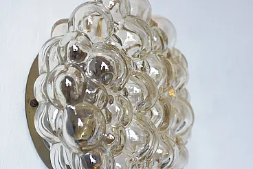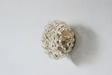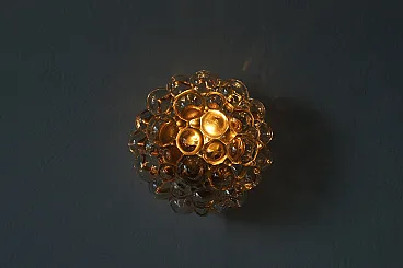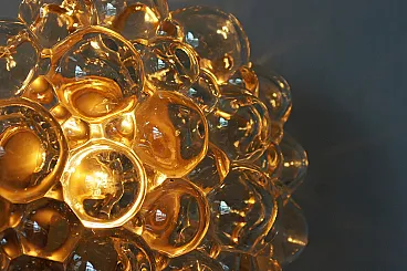 Ecco un bellissimo esempio di plafond da soffitto "Bubble Sconce" color ambra/miele, disegnato da Helena Tynell e prodotto da Glashütte Limburg in Germania negli anni 1960-70. Il design consiste in un paralume in vetro modellato a mano pieno di "bolle" convesse. Vetro spesso come il miele, modellato a mano. Struttura spumeggiante e distintiva. Grazie alla sua consistenza, il vetro diffonde delicatamente la luce, creando riflessi multistrato in calde tonalità ambrate. Le lampade di questa serie, note come "bubble glass", sono un esempio iconico di vetro artistico contemporaneo in forma utilitaria. Si montano direttamente a soffitto o a parete.