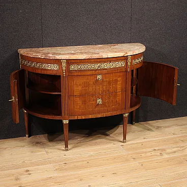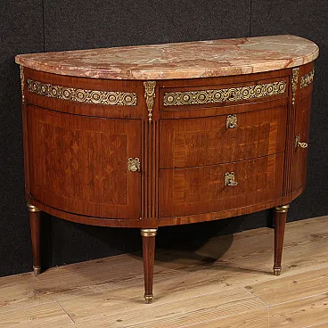 Comò a mezzaluna italiano della metà del XX secolo. Mobile in stile Luigi XVI impiallacciato e intarsiato in legni di noce, bois de rose e legni da frutto con ricco decoro in bronzo e ottone dorato e cesellato. Cassettiera munita di tre cassetti centrali e due ante laterali, di ottima capacità. Piano superiore in marmo originale che ha subito un intervento di restauro, ora in perfette condizioni. Mobile ideale da inserire in una camera, salotto o studio, completo di 5 chiavi funzionanti. Sorretto da quattro solidi piedi lignei con decori in ottone. Presenta qualche piccolo segno di usura, comò strutturalmente sano, nel complesso in buono stato conservativo.
