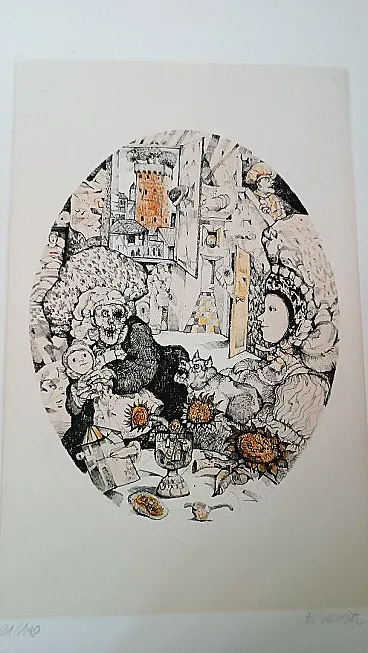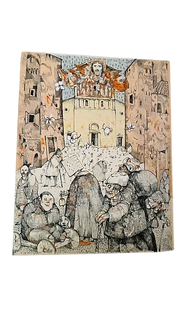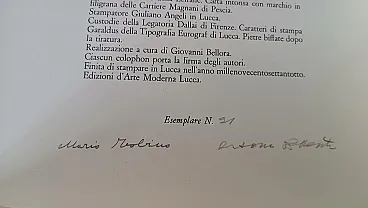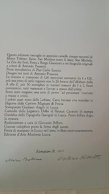 6 cartelle in-folio (mm 550x352). La prima cartella contiene la nota introduttiva di Pier Carlo Santini (Questa città) e le successive cinque contengono altrettanti racconti di Mario Tobino (Ilaria, San Martino sotto la luna, San Michele, La Zita dei fiori, Festa a borgo Giannotti). Ogni cartella reca proprio colophon. Nel complesso 6 tavole fuori testo, a colori, realizzate da Antonio Possenti, firmate e numerate a matita da questi e protette da velina, una per ogni cartella. Es. n.91, uno dei 120 esemplari numerati e firmati a mano dall'artista. Occasionali fioriture, buono stato complessivo. Cartelle editoriali originali in piena tela con titoli impressi ai dorsi, contenute entro custodia in tela e cartonato.