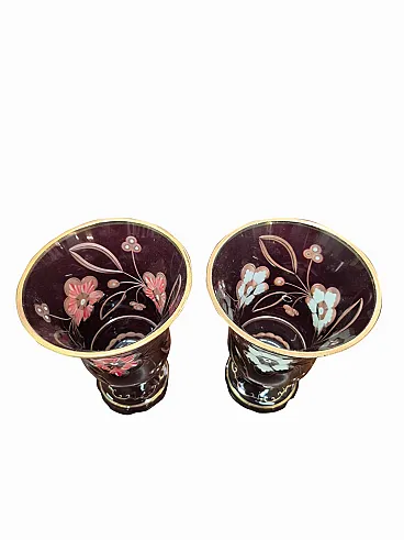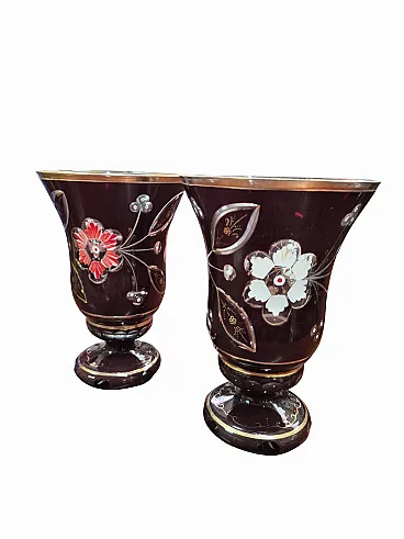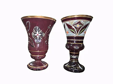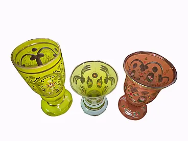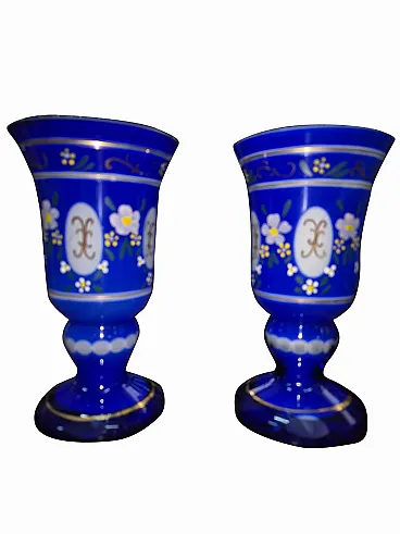 Raffinata collezione di bicchieri da esposizione in vetro di Boemia, realizzati tra la fine dell’Ottocento e i primi del Novecento. Ogni bicchiere è in vetro soffiato opalino colorato, decorato a mano con smalti floreali policromi e dettagli dorati. Le forme slanciate, le basi a balaustro e le tonalità vivaci (blu cobalto, amaranto, giallo lime, lilla e bianco latte) rendono questi bicchieri esempi autentici dell’arte vetraia boema.