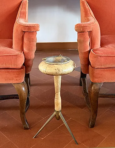 Raro posacenere da pavimento in pergamena Progettato e realizzato da Aldo Tura. Italia anni '50 Legno rivestito in pergamena tinta all'anilina. Dettagli in ottone. Insieme ad artisti come Piero Fornasetti e Carlo Bugatti, Aldo Tura (1909-1963) apparteneva sicuramente alla schiera dei ribelli del design italiano. Tura si concentrava sull'applicazione di un materiale specifico. Tura fondò il suo laboratorio a Milano nel 1939 e l'azienda è attiva da allora. H 51 cm - diam. 30 cm Condizioni: condizioni generali molto buone.