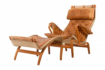 Pernilla lounge chair e pouf di Bruno Mathsson per DUX, Svezia. In originale stand con pelle color cognac. Prodotto negli anni '70. In buone condizioni con patina su pelle. Segni d'età più piccoli. Tessuto sullo sgabello con danni. Ottomana: H 41x L 62 x P 65 cm