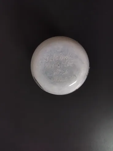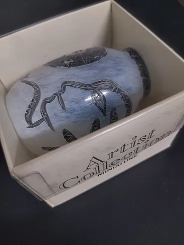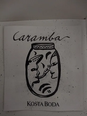 Questo splendido vaso minuscolo è la versione piccola del modello Caramba della famosa artista svedese Ulrica Hydman-Vallien è un viaggio visivo selvaggio. Il vaso in sé è bellissimo, realizzato in vetro trasparente con strisce bianche vorticose che conferiscono al pezzo un bagliore opalino. Il vetro è delicatamente soffiato in una forma semplice ed elegante; la forma ovoidale e il collo corto e largo hanno un tocco estetico di arte e artigianato. Ma questa forma aggraziata è dipinta con smalto nero in disegni selvaggi e surreali, il colore scuro crea un netto contrasto con i morbidi vortici del vetro sottostante. Ispirandosi al periodo trascorso dall'artista in Messico, alle forme astratte del dipinto vengono aggiunti anche elementi di piante e animali, che conferiscono loro la sensazione di creature totemiche o mitiche. Le forme sono posizionate nella composizione ad angoli strani, nessuna delle forme è in relazione tra loro spazialmente, dando vita a un disegno che sembra brulicare di energia, come se stessimo vedendo le origini primordiali della vita. Lo smalto è rigato con scraffito in modo che il vetro sottostante sia visibile, dando l'effetto del vetro cammeo.