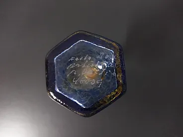 Bellissima bottiglia vintage della collezione d'artista Kosta Boda Antikva, design di Bertil Valliens. Ha meravigliosi colori vibranti che mettono in risalto la visione dell'artista, la base blu esagonale ha la firma dell'artista ed è numerata 48009