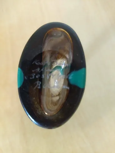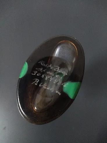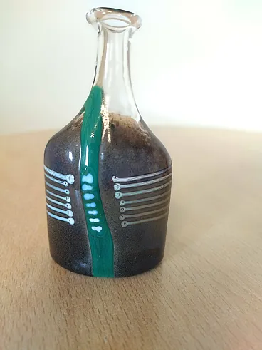 Bella bottiglia di pasta di vetro iridescente, con la pancia piatta, presenta fili di vetro colorato bianco e una colatura colore verde, incastonati in un corpo trasparente e color caffè, il prodotto è fatto a mano,