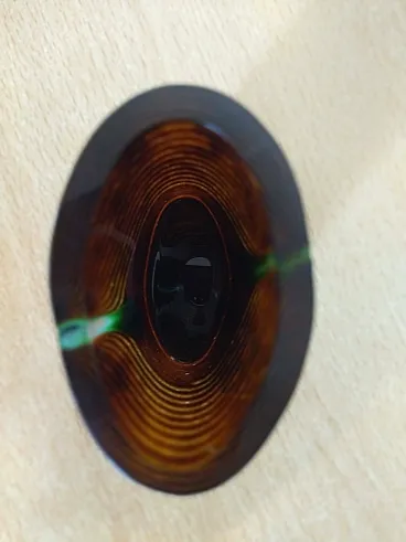 Bel vaso a pancia piatta, corpo in pasta di vetro iridescente celeste con fili di vetro colorato blu e una colatura colore verde, a piuma di pavone, il prodotto è fatto a mano,