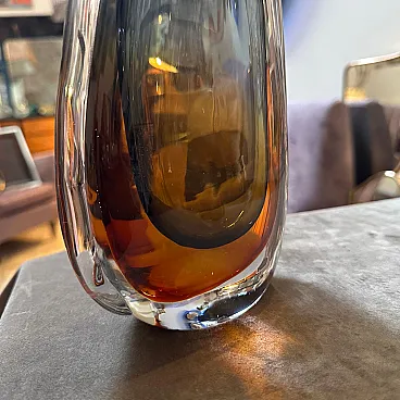 Stupendo vaso moderno anni '70 in vetro di Murano Glass Sommerso verde e marrone di Seguso Questo squisito vaso è una vera e propria testimonianza delle tecniche innovative di Seguso degli anni Settanta. Questo pezzo mette in mostra la celebre tecnica del "Sommerso", in cui strati di vetro colorato sono racchiusi all'interno di vetro trasparente, creando una profondità ipnotica e un effetto visivo sorprendente. Questo vaso in particolare presenta una sofisticata tavolozza di tonalità marroni profonde e verdi sottili, che passano con grazia e si fondono nello strato esterno cristallino. La forma organica e scultorea con i suoi caratteristici "Horn" o punte allungate sul bordo aggiunge un'eleganza dinamica e moderna al pezzo, caratteristica dei design d'avanguardia dell'epoca. Il peso consistente e la finitura impeccabile testimoniano l'eccezionale qualità e abilità dei soffiatori di Murano. Quando la luce interagisce con i vari strati, i colori cambiano e brillano, rendendo questo vaso un oggetto decorativo accattivante anche senza composizioni floreali. È un complemento perfetto per i collezionisti di vetro di Murano, per gli appassionati di design del Mid-Century Modern e degli anni '70 o per chiunque cerchi un pezzo unico e lussuoso per la propria casa o il proprio ufficio. È in eccellenti condizioni vintage, senza schegge e crepe sul vetro.