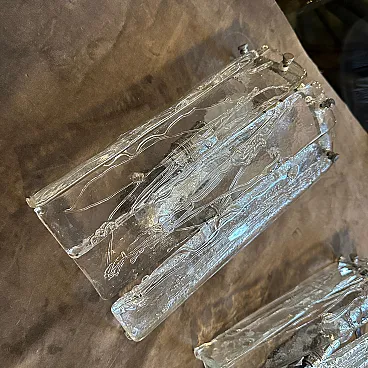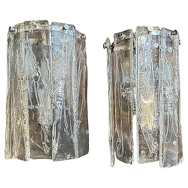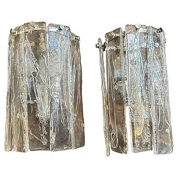 Coppia di straordinarie lampade da parete in acciaio e vetro di Murano degli anni '70 di La Murrina Questa affascinante coppia di applique vintage è stata magistralmente realizzata a Murano, in Italia, dai rinomati vetrai La Murrina durante l'iconica era dell'A Space AGE degli anni Settanta. Queste applique non sono semplici apparecchi di illuminazione, ma opere d'arte scultoree che incarnano lo spirito futuristico e artistico del loro tempo. Ogni applique presenta pannelli verticali multipli di spesso vetro trasparente di Murano, meticolosamente formato a mano con una superficie organica e strutturata che crea un gioco ipnotico di luci e ombre. Gli intricati motivi astratti incorporati nel vetro evocano un senso di movimento dinamico, caratteristico dell'estetica del design A Space AGE. I pannelli di vetro sono fissati con eleganza a un telaio d'acciaio minimalista, che mette in risalto la trasparenza e la maestria del vetro, garantendo al contempo una struttura robusta. Quando sono accese, queste applique proiettano un bagliore caldo e davvero unico; sono perfette per aggiungere un tocco di lusso vintage e una dichiarazione di design distintiva a un salotto contemporaneo, a un corridoio, a una camera da letto o a un interno curato e moderno di metà secolo. Eccellenti condizioni vintage. Il vetro non presenta scheggiature o crepe e le cornici in acciaio mostrano minimi segni di età, in linea con la loro natura vintage. Completamente funzionante e pronto per l'installazione. Si raccomanda un'installazione professionale.