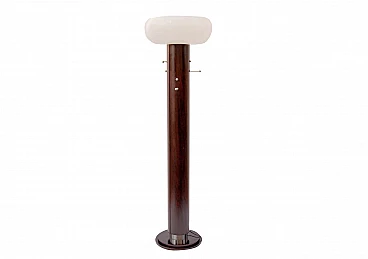Appendiabiti a piantana con lampada, anni '70. La colonna a cilindro è in legno curvato, diviso in due elementi accoppiati, con appendiabiti cromato; base in legno con fascia sovrastante cromata; diffusore in metacrilato stampato. Oggetto in ottime condizioni. Può presentate lievissime tracce del tempo. Diametro diffusore cm. 60