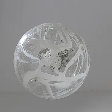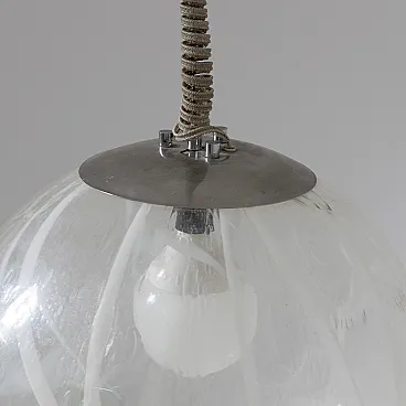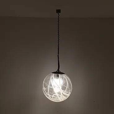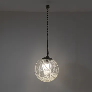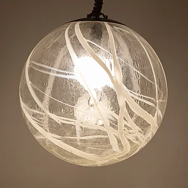 Lampada a sospensione in vetro soffiato con decoro bianco, anni ’70