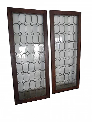 Coppia di finestre in abete con vetri piombati, anni '50.