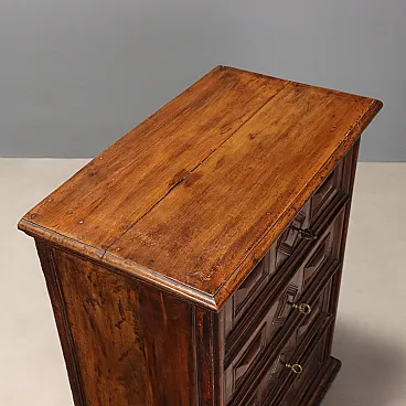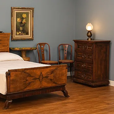 Comodino in stile barocco in noce e piuma di noce, costruito con legni antichi. Fronte a quattro cassetti con formelle, piedi a mensola, interni in abete. Italia, XX Secolo.
