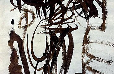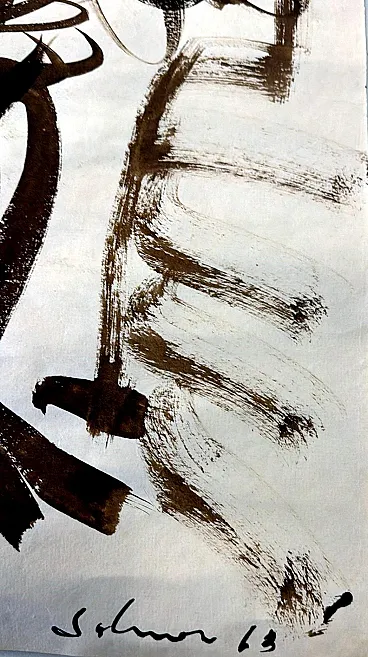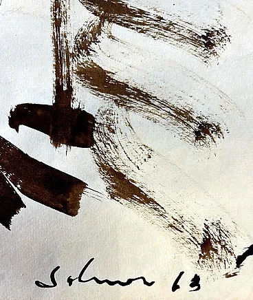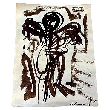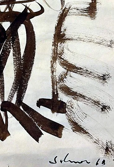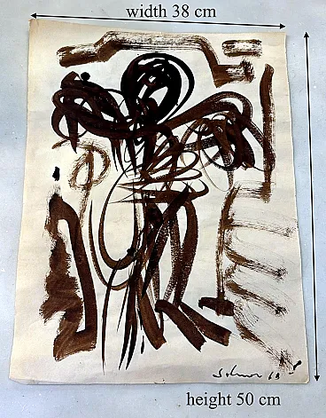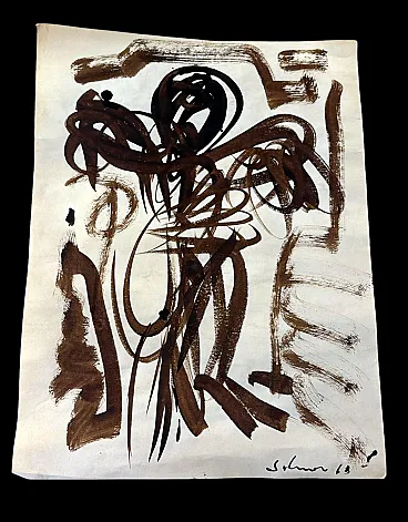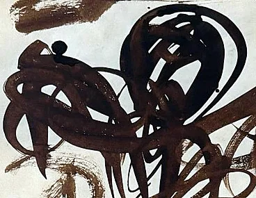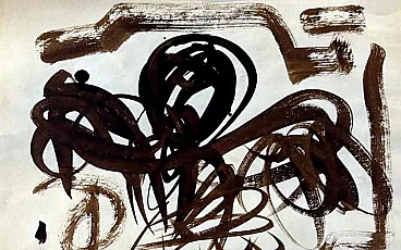 Opera astratta su carta speciale, realizzata con una tecnica mista che comprende acquerello, tempera diluita e inchiostro. L'opera appartiene chiaramente al movimento astratto ed espressionista tipico dei primi anni Sessanta. Porta una firma (illeggibile) ed è datata 1969. La composizione si distingue per il suo gioco dinamico di segni grafici e strati trasparenti di colore - sfumature di marrone, beige e nero - che formano una struttura complessa e visivamente ricca. Il linguaggio pittorico richiama l'estetica europea, in particolare francese e italiana, dell'Artistics Informel (o astrazione gestuale) e del Tachisme, movimenti emersi negli anni '50 e '60, con affinità con la sperimentazione gestuale di artisti come Emilio Scanavino e Georges Mathieu. Si tratta di un linguaggio che si basa sul gesto spontaneo e sulla consistenza dei materiali, riecheggiando anche elementi dell'Espressionismo astratto americano - pensa a Franz Kline o Robert Motherwell - ma con un tono più lirico e intimo. Particolarmente degno di nota è il tipo di carta utilizzata dall'artista: spessa, compatta, con una grana visibilmente pronunciata e un tatto leggermente rigido. Questo supporto altamente tattile gioca un ruolo fondamentale nel migliorare l'impatto espressivo dell'opera. Lo stato di conservazione è buono, con lievi segni d'età coerenti con l'epoca in cui l'opera è stata realizzata. Dimensioni: larghezza 38 cm (14,9 in), altezza 50 cm (19,7 in). L'opera viene venduta senza cornice, consentendo all'acquirente di scegliere la presentazione che meglio si adatta al suo spazio e al suo stile d'arredamento.