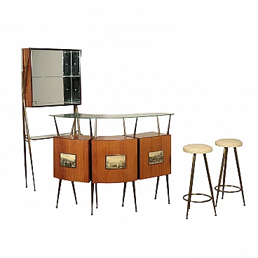 Mobile bar con banco, vetrina e coppia di sgabelli. Legno impiallacciato palissandro, ottone, vetro, stampe decorative.