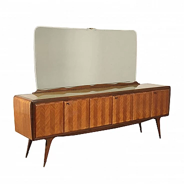 Mobile buffet con specchio in legno impiallacciato mogano, piano in vetro retrò trattato.