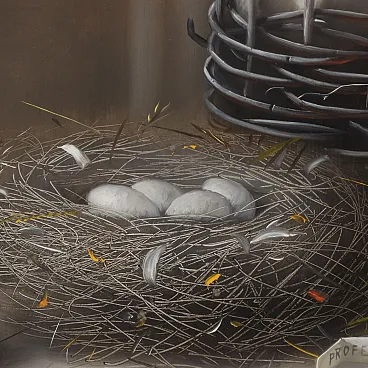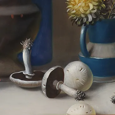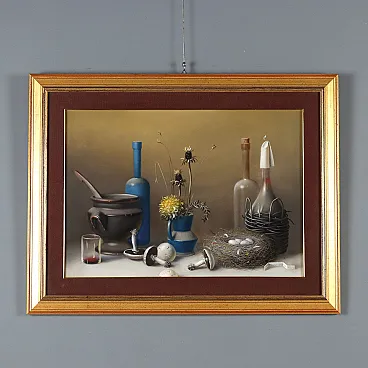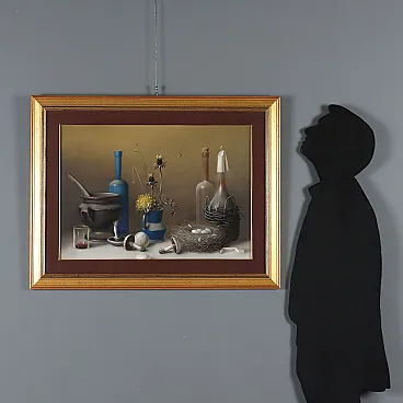 Anche questa composizione appartiene alla linea figurativa, una composizione lineare e ordinata, sia nella collocazione degli oggetti che nelle scelte cromatiche, di oggetti d'uso quotidiano indicativi di una vita contadina.