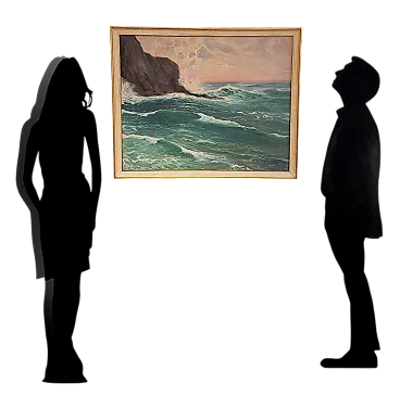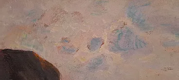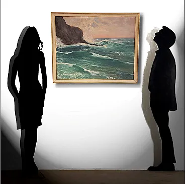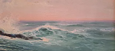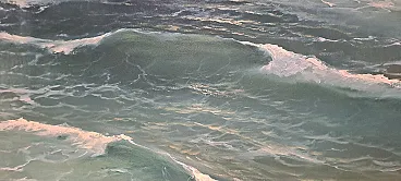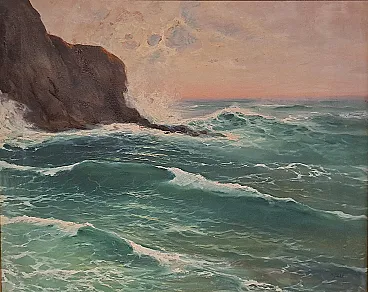 Questo affascinante dipinto, opera del pittore ligure Giuseppe Caselli (1893-1976), cattura la potenza e la bellezza del mare.