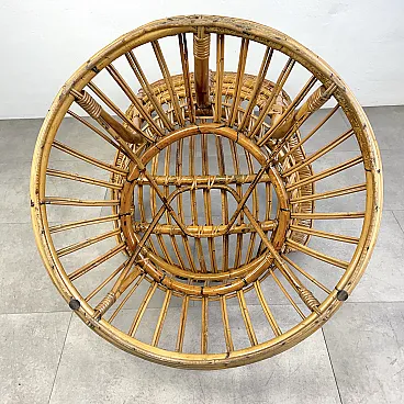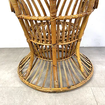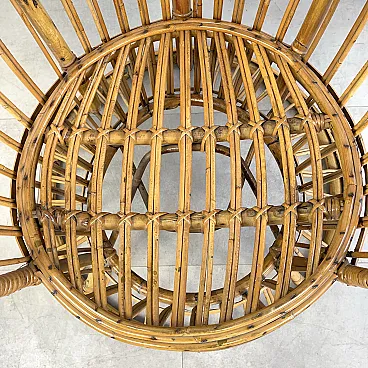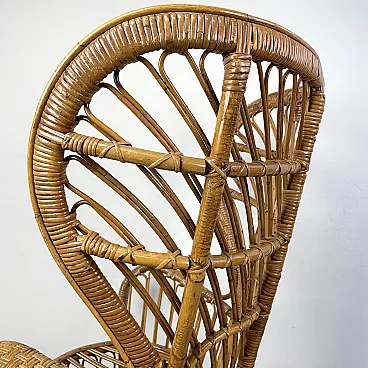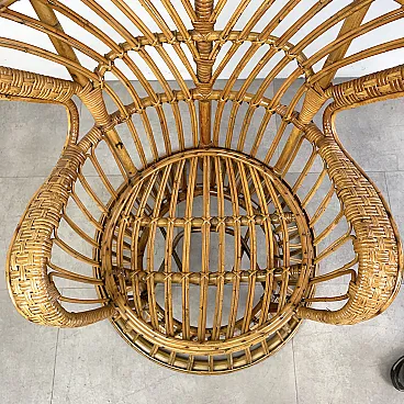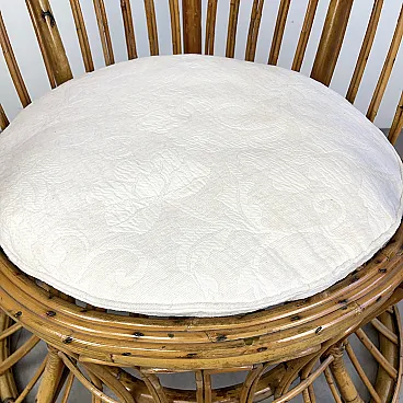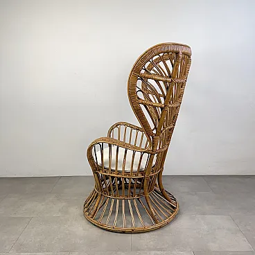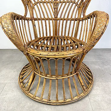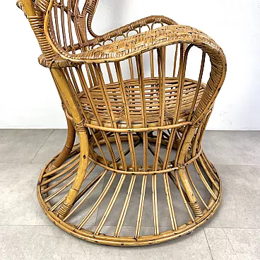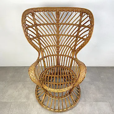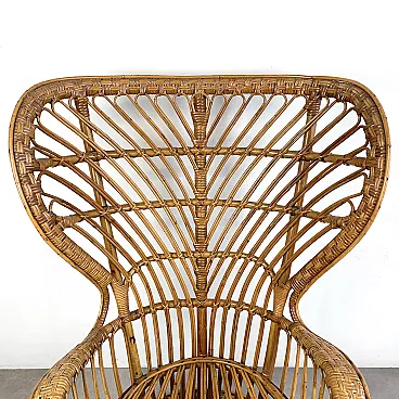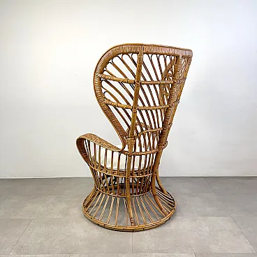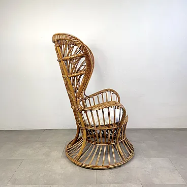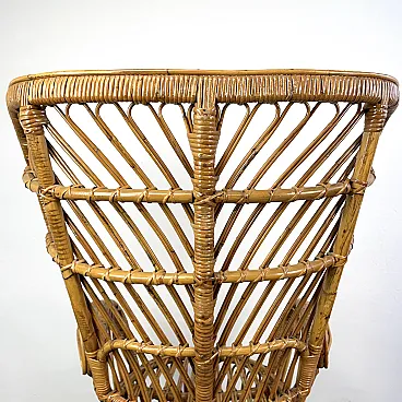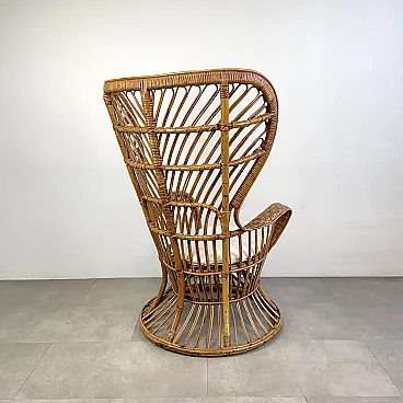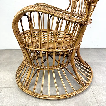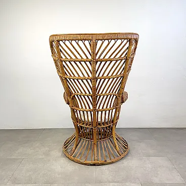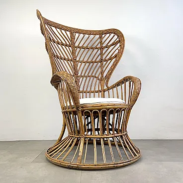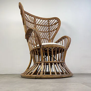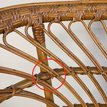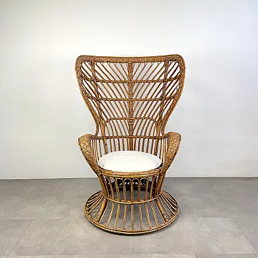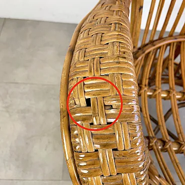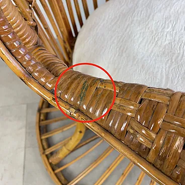 La poltrona di Rush di Rattan progettata negli anni '50 da Lio Carminati per la casa e il giardino. Molto elegante e confortevole. Dotato di cuscino coperto di tessuto bianco. La poltrona è in ottime condizioni e ha solo 3 difetti evidenziati nelle fotografie relative con un cerchio rosso. Il suo finale con vernice protettiva lucida è in ottime condizioni.