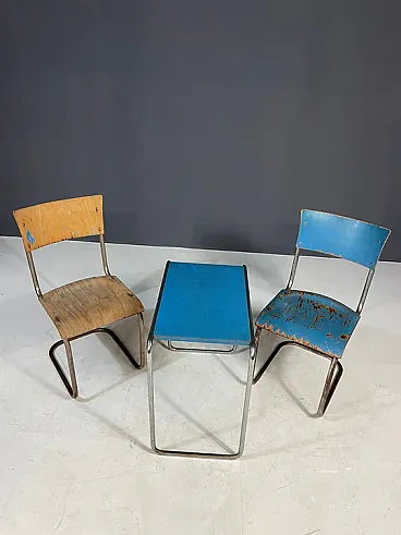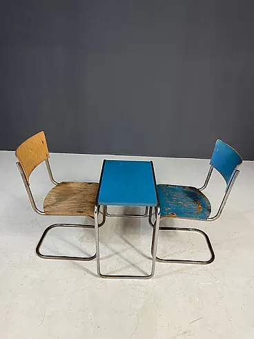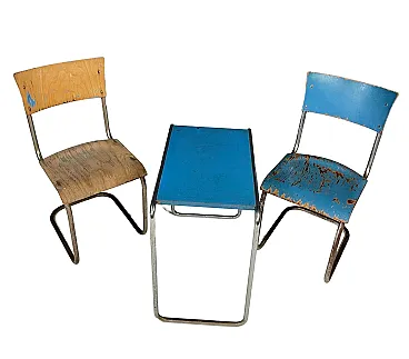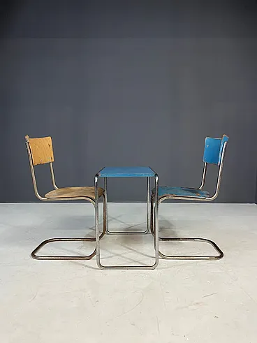 Il set include due sedie cromate a sbalzo e un tavolo laterale abbinato, molto probabilmente prodotto da Slezák Company.