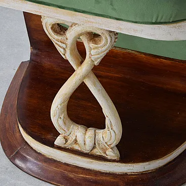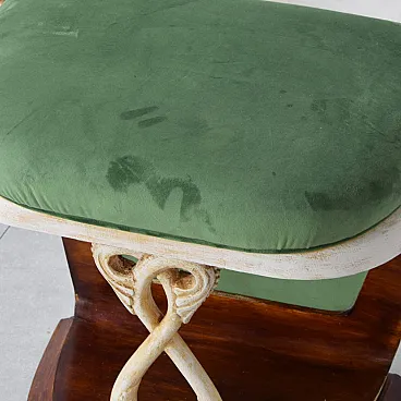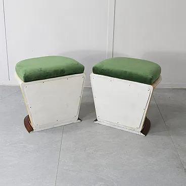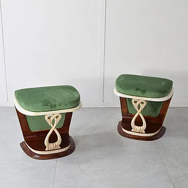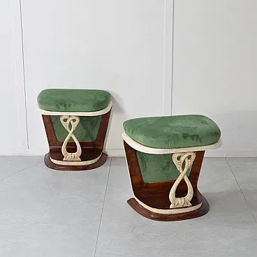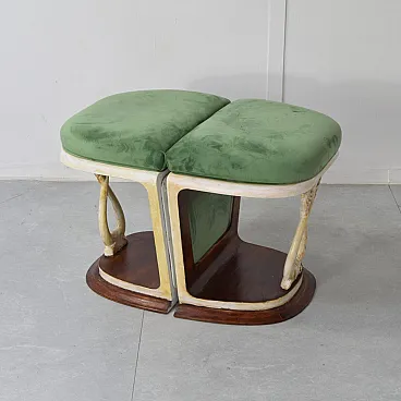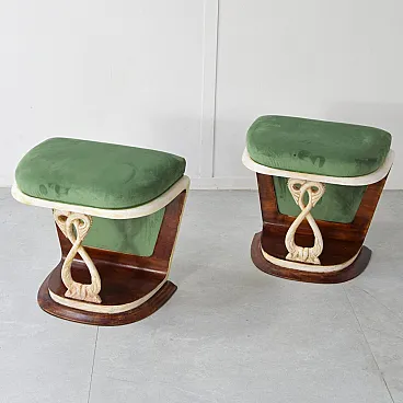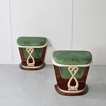 Coppia di sgabelli di design italiano, probabilmente del periodo Art Déco o Mid-Century, risalenti agli anni ’40 o ’50. Sono attribuiti a Pier Luigi Colli, in particolare il modello “Sgabelli” o “Sgabelli per toeletta”. Gli sgabelli hanno una struttura in legno scuro e curvato, con una seduta imbottita e rivestita in velluto verde, che mostra segni di usura, come si può notare dalla patina. La seduta ha una forma rettangolare con angoli arrotondati, per un maggiore comfort e un’estetica più morbida. Sotto l’imbottitura c’è un supporto in legno laccato di colore chiaro (probabilmente panna o avorio), che si ricollega alla base. Questi sgabelli sono un ottimo esempio di artigianato italiano e di design d’epoca, combinando eleganza formale e linee sinuose. Si prestano a diverse ambientazioni, come sgabelli per una toeletta in camera da letto o come sedute d’accento in un salotto. Il loro design, caratterizzato da curve e contrasti di colore e materiale, li rende un pezzo di arredamento unico e di grande impatto visivo.