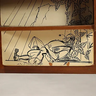 Letto vintage a una piazza con testiera e pediera in legno, gambe in metallo smaltato, comodino pensile con piccolo vano a giorno.