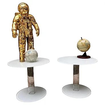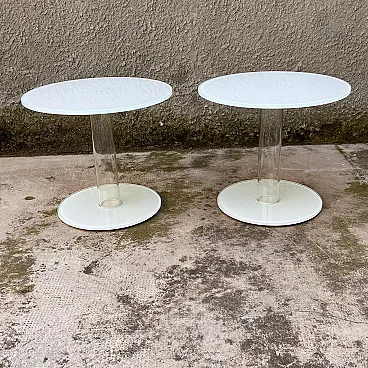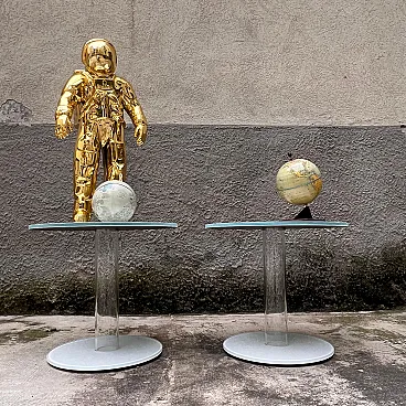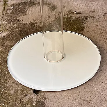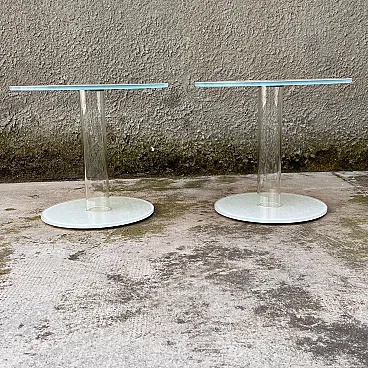 tavolino Glas Italia, tavolino Piero Lissoni, tavolo in vetro, tavolino design contemporaneo, tavolo vetro extrachiaro, tavolino minimal, coppia tavolini moderni, arredo contract, tavolo laccato bianco, design italiano vetro, Glas Italia table, Piero Lissoni table, glass side table, minimalist coffee table, extra-clear glass furniture, white lacquered table, pair of modern tables, Italian glass design, contemporary designer table, contract furniture Elegante tavolino da appoggio modello “HUB”, disegnato da Piero Lissoni per Glas Italia. Realizzato in vetro extrachiaro trasparente e laccato bianco, questo tavolino presenta una struttura cilindrica in vetro soffiato che collega base e piano, entrambe in vetro temperato con finitura lucida. Il montaggio avviene tramite un raffinato sistema ad anello metallico filettato, visibile nei dettagli tecnici delle foto. Il design è essenziale e sofisticato, giocato su trasparenze, equilibrio e leggerezza visiva. Ideale come tavolino da salotto, da lato divano o per ambienti contract, questo pezzo rappresenta perfettamente lo stile minimalista ed architettonico tipico del lavoro di Lissoni. Piero Lissoni (n. 1956) è uno dei più influenti architetti e designer contemporanei italiani. Fondatore di Lissoni & Partners, collabora con i più importanti marchi del design internazionale, tra cui Glas Italia, B&B Italia, Cassina, Living Divani, Kartell e Alessi. Il suo stile è caratterizzato da rigore formale, sobrietà estetica e una profonda attenzione ai dettagli e alla proporzione architettonica. Con Glas Italia, Lissoni ha sviluppato collezioni che sperimentano le potenzialità espressive del vetro in chiave contemporanea e minimalista. Fondata a Macherio (MB), Glas Italia è una delle eccellenze italiane nella lavorazione del vetro per il design e l’arredamento. Collaborando con grandi nomi dell’architettura e del progetto (Philippe Starck, Nendo, Lissoni, Edward Barber & Jay Osgerby), Glas Italia si distingue per l'uso sperimentale e innovativo del vetro, la precisione costruttiva e una qualità manifatturiera senza compromessi. Ogni pezzo è il risultato di un processo di lavorazione altamente specializzato che valorizza la trasparenza, la luce e la purezza del materiale.