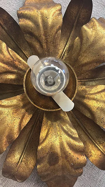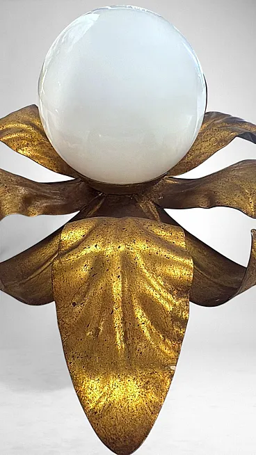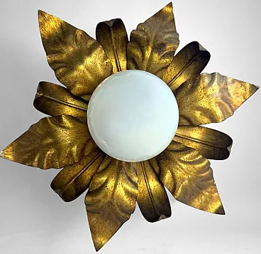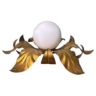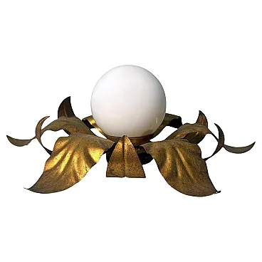 Lampada da soffitto in ottone dorato e vetro opalino, metà '900