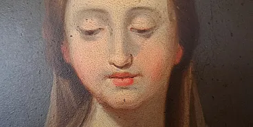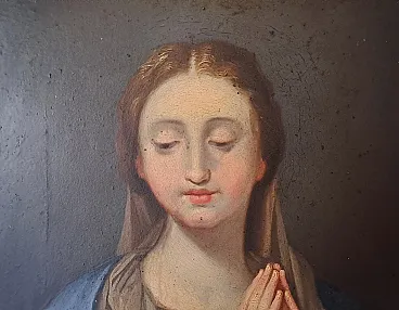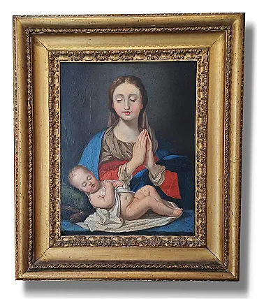 Questo raffinato dipinto a olio su rame, databile al XVIII secolo, raffigura un classico soggetto religioso: la Madonna con il Bambino.