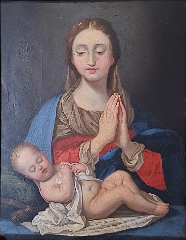 Soggetto: La Vergine Maria è ritratta in una posa di preghiera, con le mani giunte, mentre osserva con tenerezza il Bambino Gesù addormentato sulle sue ginocchia.
