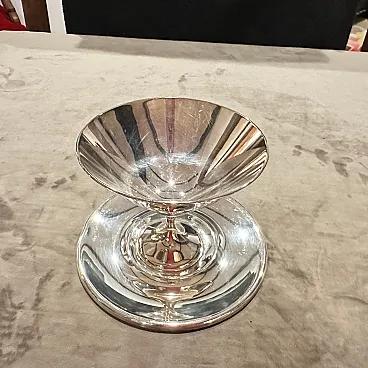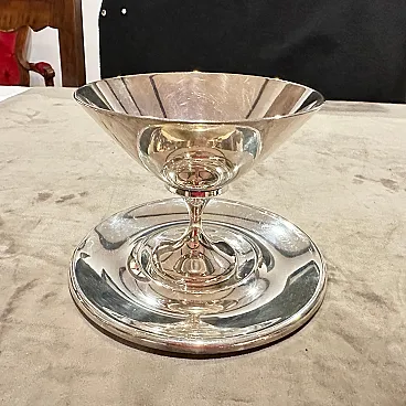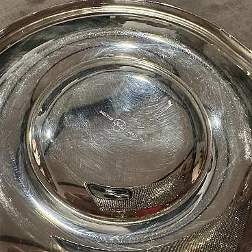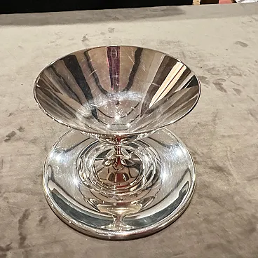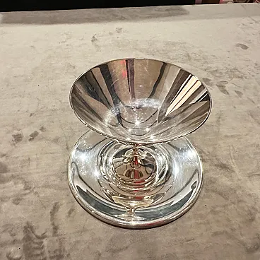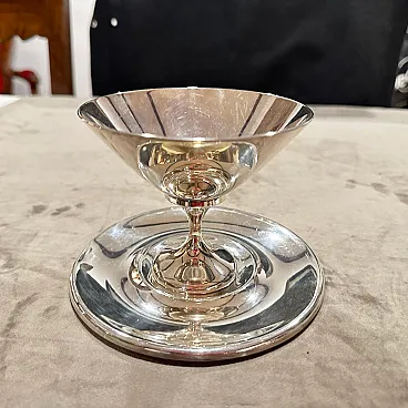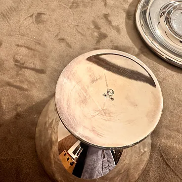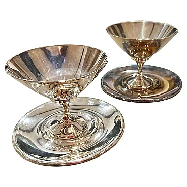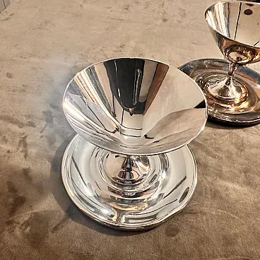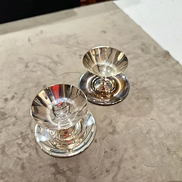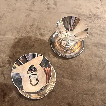 Un set di due tazze moderniste placcate in argento e piatti coordinati, disegnati dal famoso designer italiano Lino Sabattini. Perfetta rappresentazione del design italiano del dopoguerra, questo set incarna l'estetica elegante e minimalista per cui Sabattini è famoso, traendo ispirazione sia dal modernismo che dalle forme classiche. Ogni pezzo è caratterizzato da una finitura a specchio altamente lucida che riflette magnificamente la luce. Le tazze sono disegnate con la classica silhouette del vetro martiniano, mentre i piatti di accompagnamento sono leggermente concavi, creando una presentazione armoniosa e sofisticata. Il design è scultoreo e funzionale allo stesso tempo, per questo è un accento decorativo di grande effetto o un set da portata unico per le occasioni speciali. La parte inferiore dei piatti è contrassegnata dal marchio "Sabattini Made in Italy", che ne garantisce l'autenticità e la provenienza. Questo set è in ottime condizioni d'epoca con lievi segni di usura dovuti all'età, che non ne compromettono la bellezza e la brillantezza. Se sei un collezionista di design di metà secolo o postmoderno, un conoscitore dell'artigianato italiano o semplicemente alla ricerca di un pezzo forte per aggiungere un tocco di eleganza senza tempo alla tua casa, questo set di Lino Sabattini è una vera scoperta.