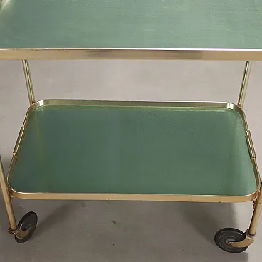 Carrellino di servizio vintage in metallo ottonato con rotelle e doppio piano verde.