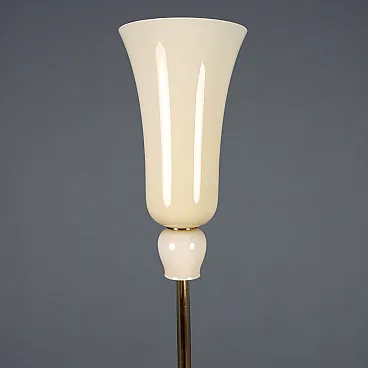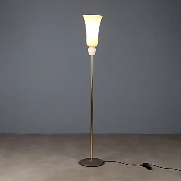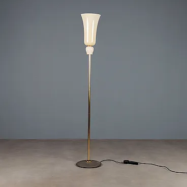 Elegante lampada da terra che richiama le forme degli anni '30 come suggerito dal nome con base in metallo, stelo e diffusore in vetro paglierino. Non monta lampade LED, 1 lampadina con attacco E27 max 250 watt.