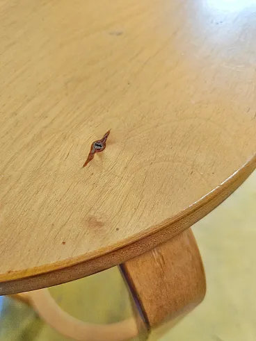 I piani di seduta circolari mostrano quella sagomatura leggera tipica del design funzionalista, ottenuta per pressatura del compensato multistrato. La finitura naturale del legno evidenzia la qualità della lavorazione e conferisce a ogni pezzo un carattere individuale attraverso le venature specifiche.