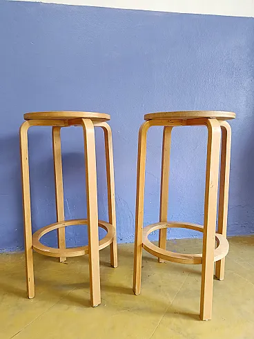 Questa coppia di sgabelli alti rappresenta un approccio minimalista al design nordico, dove la funzionalità si esprime attraverso la massima semplicità costruttiva.