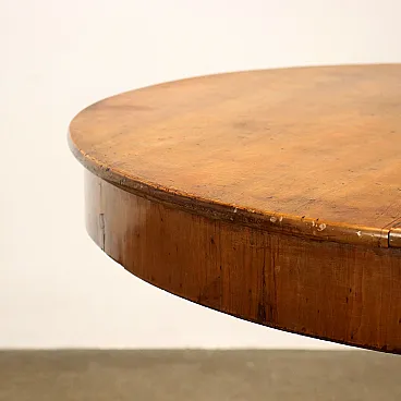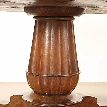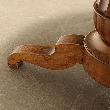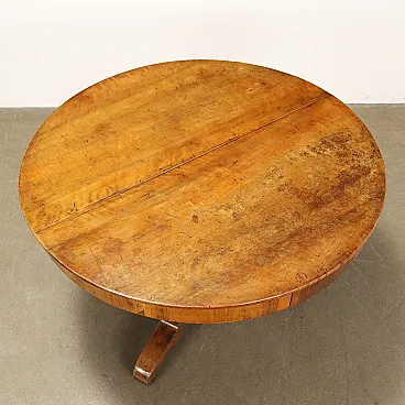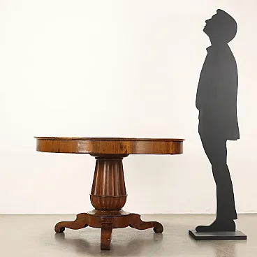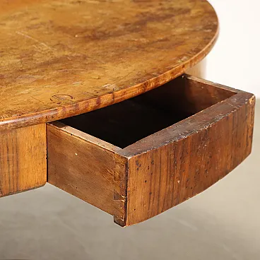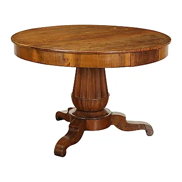 Tavolo rotondo in noce, cassetto nella fascia sotto piano, gamba centrale poggiante su tre piedi mossi. Mancanze Italia, XIX Secolo.