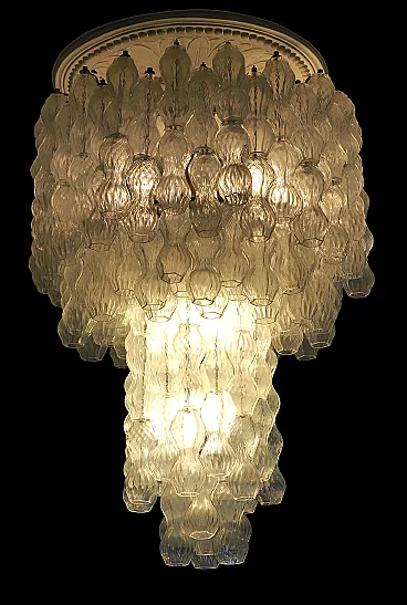 La struttura presenta poliedri in vetro soffiato trasparente con caratteristica texture ondulata/scanalata, disposti a cascata su più livelli degradanti a creare un gioco di rifrazione della luce attraverso le numerose sfaccettature degli elementi che compongono il lampadario.
